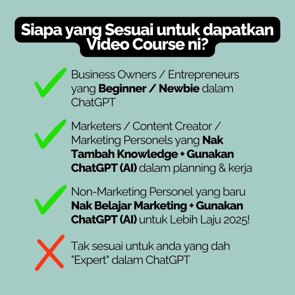 Anda mungkin agak sukar untuk faham jika tiada basis langsung dalam Marketing, sebab contoh2 & prompt2 yang saya berikan adalah untuk kegunaan bahagian Marketing. Namun jika niat anda hanya nak tahu fundamental & cara berfikir bila guna ChatGPT, & anda yakin boleh aplikasikan sendiri dalam bidang anda, boleh dapatkan Module ni!
